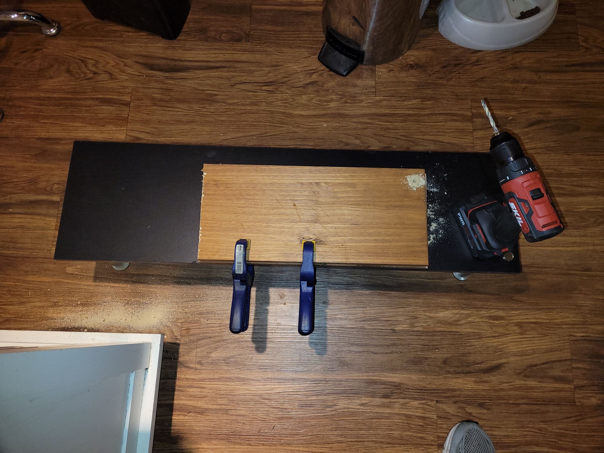 I cleverly clamped the two hanging shelves to the top shelf and drilled four holes all the way thru the shelves. I could have spaced them a little closer to the edges, but I can come back and try that later if I need to make more width on the self.