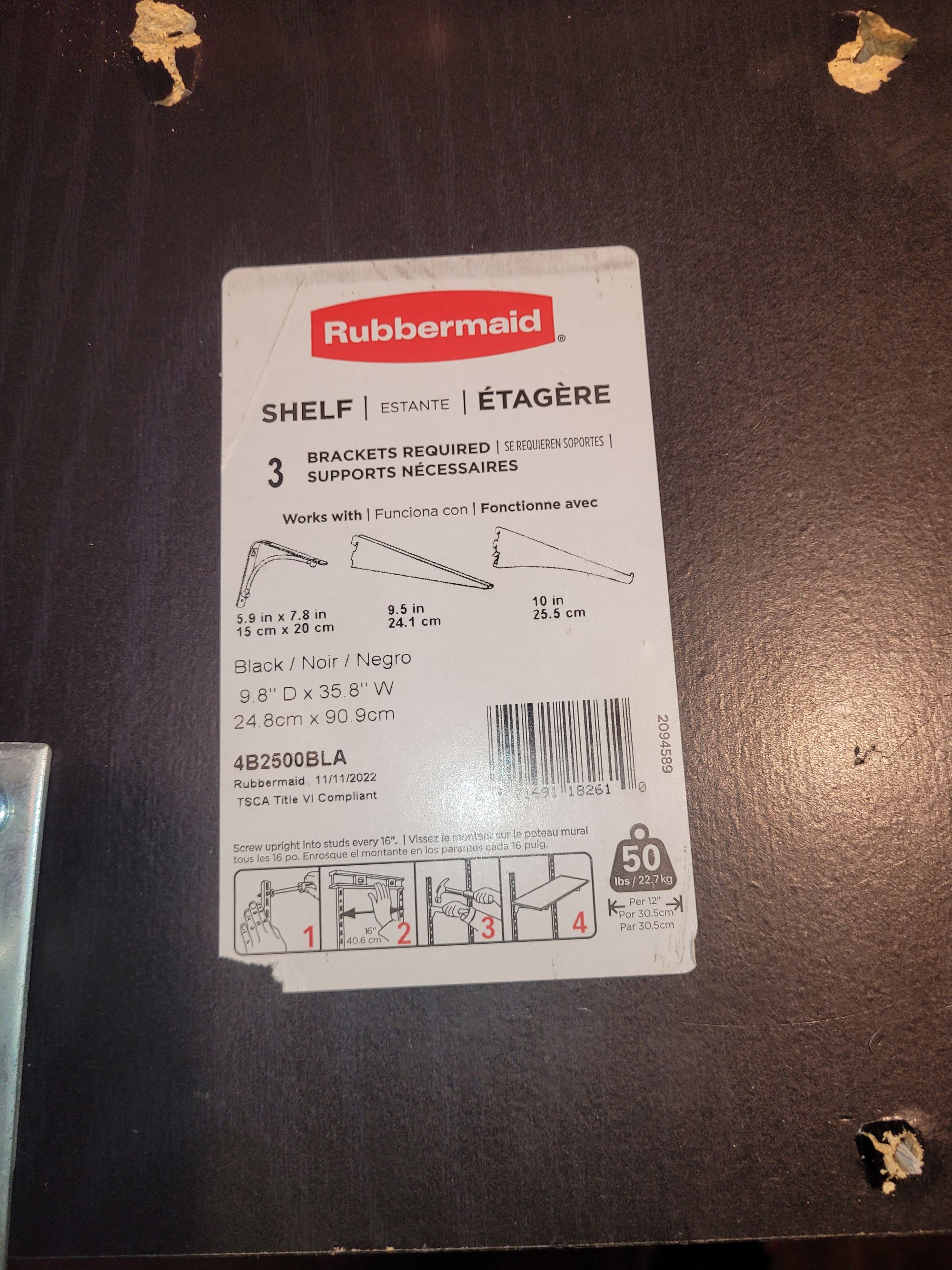 Then I spent a few weeks thinking about making shelves hanging from the Rubbermaid top shelf of the stand. I devised a plan to use six-inch threaded screws for the hanging shelves. I wanted something thin, like sheet metal for the lower shelves, which Daniels build had going for it. Nothing has shown up on the curb while walking the dog lately. However, I found a free wood shelf board on the curb while walking the dog a month back. Cut in half. It gives me the length of the shelves I am after. Wide enough for my 17" PC notebook to perch on, to be both out of the way and easy to get at for projects.