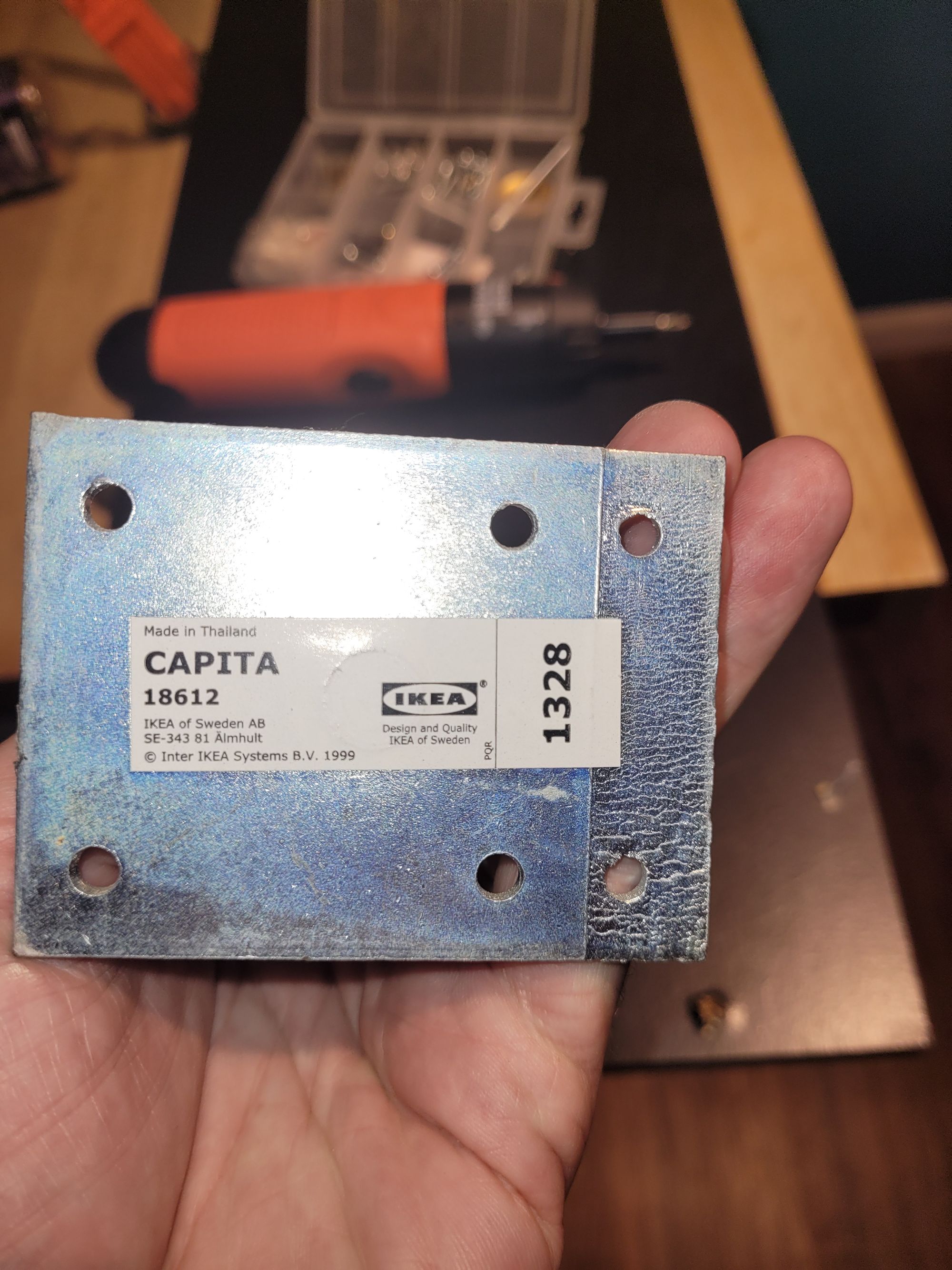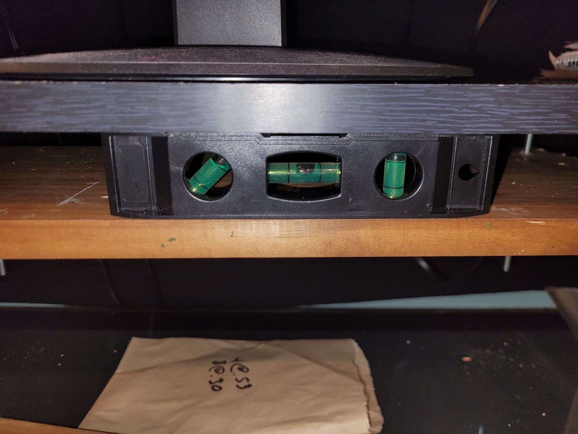 This modification is inspired by my nerd crush Daniel Titchener. See a link to the build on youtube. He has a popular Youtube channel that discusses in interior design and living in small spaces. I looked for the monitor stand he used for a client's desk and decided I could create a reasonable facsimile for my modest budget. I had four 21 cm legs from Ikea from a previous shoe stand project in our last apartment. I kept the legs for just this kind of application. I splurged on a dark wood three-foot Rubbermaid shelf from the hardware store for the top of the stand. Then I screwed the Ikea legs to the bottom of the Rubbermaid shelf, which puts my monitor at a much better height.