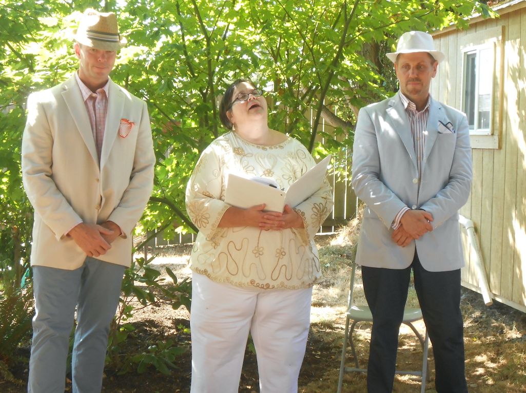 We have our tenth anniversary coming up this next week. It makes me happy we pulled it off. Same-sex union, license, food, rentals, my family, his family, all while living in LA for A Seattle date in his sister's backyard. Thanks to Karen Sticklin. Our wedding day was an out-of-town disaster waiting to happen. However, It turned out lovely. I have beautiful memories of that day and the people who came together for us. I want to shout out to our friend Peggy Platt who got us together entirely by accident when she recommended me as good roommate material to my husband, Mark. "Good roommate, but don't date him," she told him by phone. Later when we got married, she was our official—wedding minister.